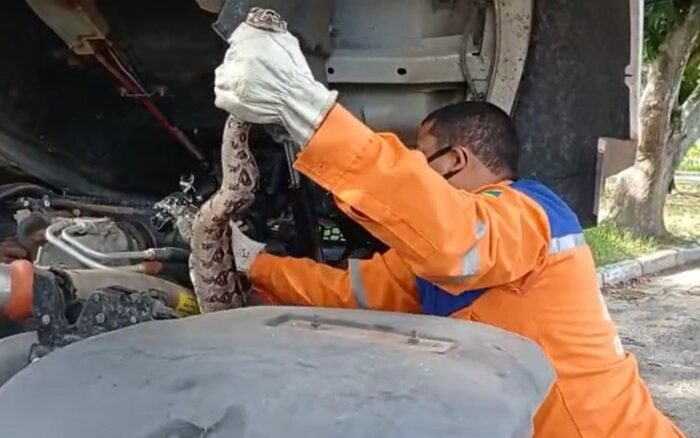 O resgate foi feito pela Defesa Civil, que identificou que a cobra é uma jiboia adulta. O órgão foi acionado pelo motorista do veículo, por meio do 199.
