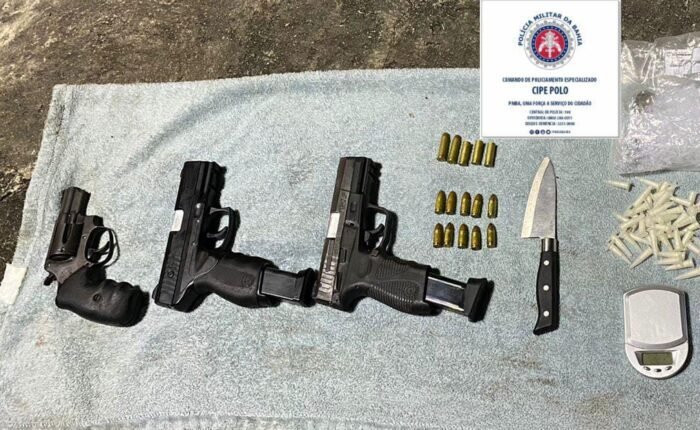 Além das armas, também foram encontrados 48 pinos de cocaína, 80 pacotes de maconha, duas balanças, uma faca e embalagens para armazenar drogas. A ocorrência foi registrada na 25ª Delegacia Territorial (DT) de Dias D’Ávila