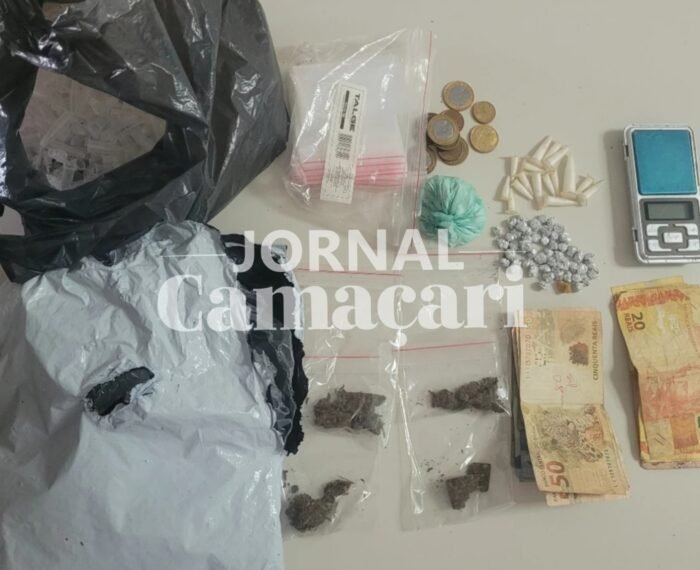 Na abordagem, foram apreendidos 04 porções de maconha, 51 pedras de crack, 16 pinos de cocaína, um saco contendo cocaína a granel, uma balança de precisão, embalagens para acondicionar drogas e a quantia de R$ 432,50 em espécie.