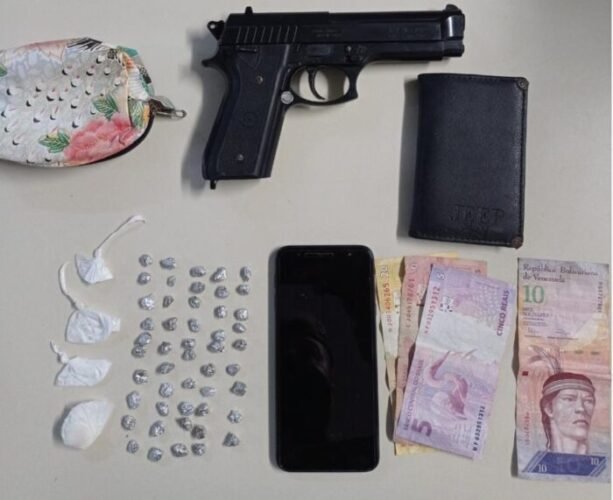 Durante a tentativa de fuga, um dos jovens ainda tentou se livrar de um simulacro de pistola. Feita a busca pessoal, foram encontradas com os suspeitos 49 pedras de crack e 03 porções de cocaína, além de dinheiro venezuelano (Bolivar).