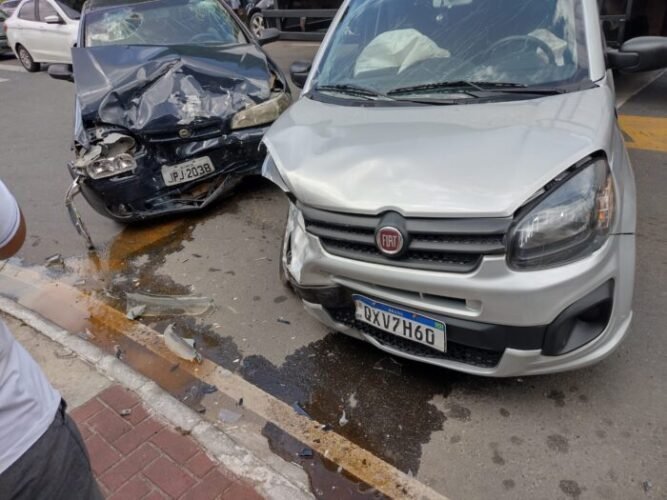 Dois veículos de passeio, sendo um Fiat Pálio e um Uno, tiveram uma colisão frontal, deixando vítimas com lesões graves. Um homem chegou a ter as duas pernas quebradas após o impacto.