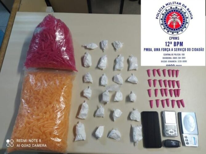 Foi realizada a interceptação e abordagem. Durante a busca no veículo, foram encontradas drogas, pinos, embalagens diversas e balanças de precisão.