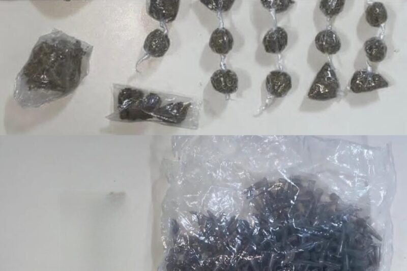 Na sequência da ocorrência, já na Rua J, um homem foi visto pulando o muro de uma residência. Ele foi acompanhado e alcançado pelos policiais. Durante a abordagem, foi realizada busca pessoal, sendo encontrado com o suspeito 16 trouxas de substância análoga à maconha, um saco contendo pinos tipo eppendorf, uma balança de precisão.