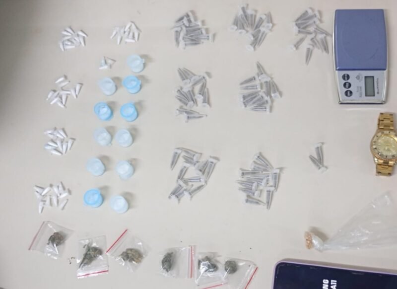 Durante a revista, foram encontrados entorpecentes e materiais comumente utilizados na atividade criminosa. Entre os itens apreendidos estavam porções de drogas conhecidas como K9, além de cocaína e crack, uma balança de precisão, um aparelho celular e um relógio.