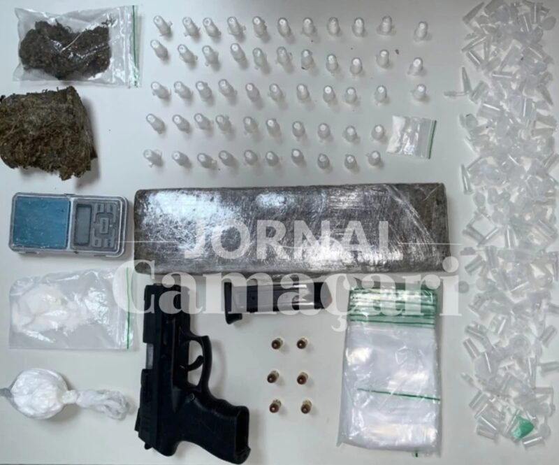 Durante a revista, foi encontrada uma pistola calibre .380 com numeração suprimida, além de porções de entorpecentes e materiais utilizados para o tráfico de drogas.