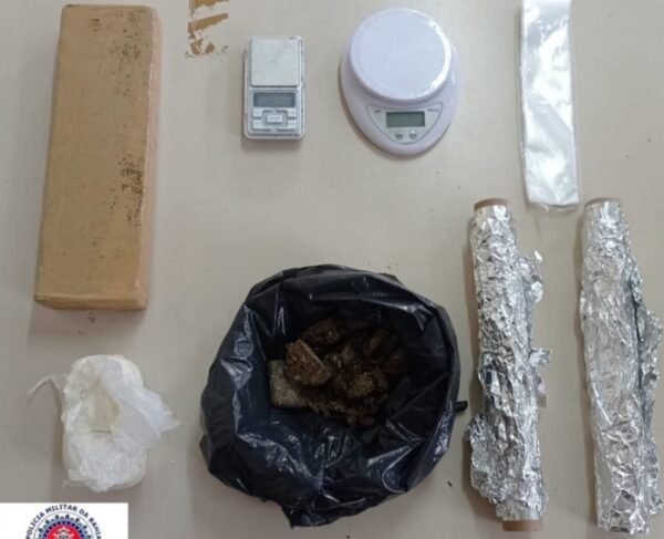 Após busca pessoal, foi encontrada dentro da mochila do suspeito 01 tablete de maconha, 01 tablete de cocaína,18 porções de cocaína, 02 balanças de precisão, material para acondicionamento de drogas.