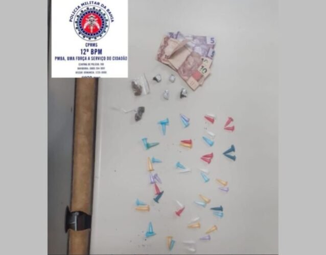 Policiais militares do 12° Batalhão conduziram à delegacia um jovem, morador de Camaçari, pela suspeita da prática de tráfico de drogas no último sábado (8) no Algarobas I .