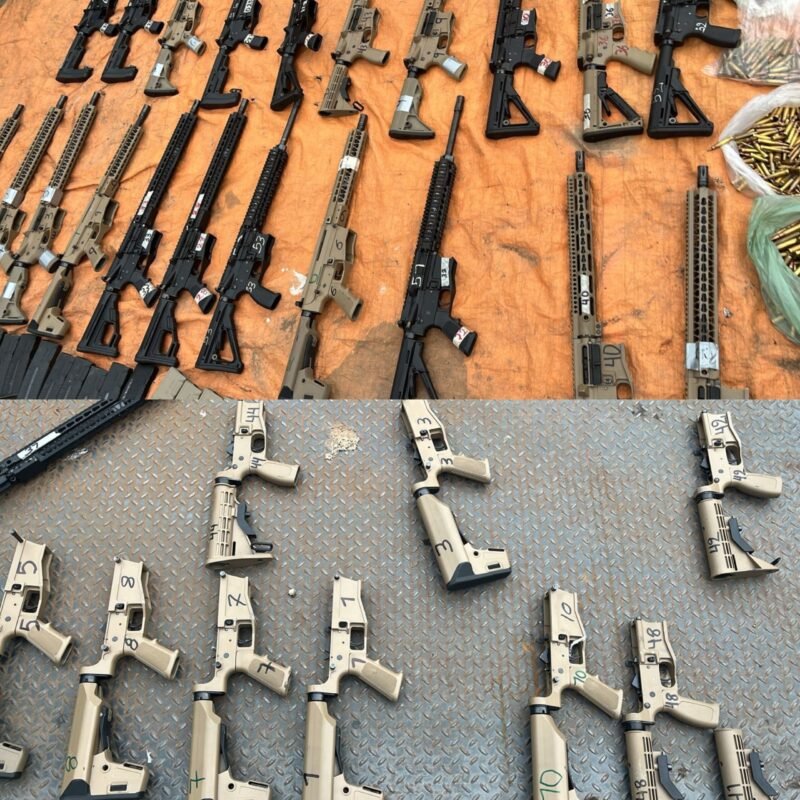Até o momento, foram apreendidos 22 fuzis montados, dos calibres 7,62 e 5,56, além de outros fuzis desmontados, grande quantidade de munições de diversos calibres e 22 tabletes de cocaína.