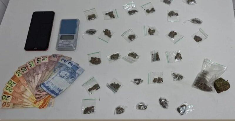 De imediato, os policiais deslocaram-se até o local e iniciaram rondas na região. Embora o suspeito armado não tenha sido localizado, durante as incursões outro indivíduo foi avistado e abordado. Com ele, os agentes encontraram um saco plástico contendo R$ 179,00 em espécie, uma balança de precisão, 29 dolas de maconha, um “dolão” da mesma substância e um aparelho celular.