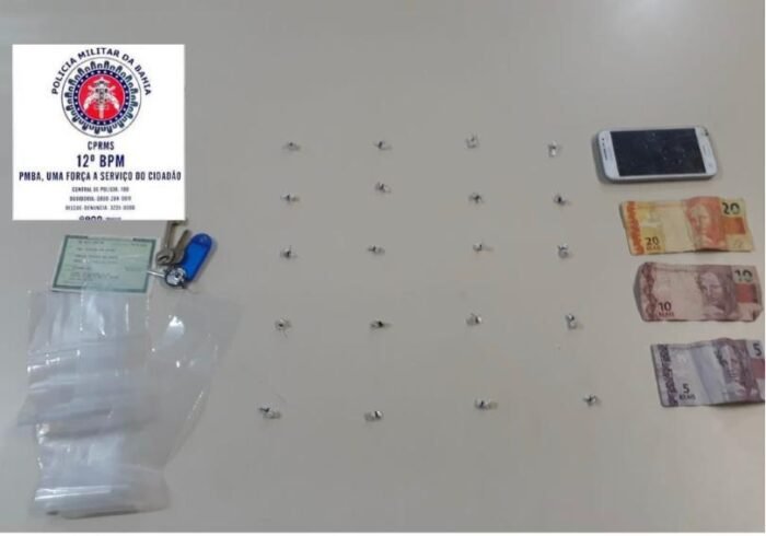 Durante patrulhamento ao longo da Rua da Linha, no Bairro dos 46, policiais militares da CETO receberam a denuncia de que um jovem estaria vendendo drogas nas proximidades. Localizado o individuo, foi feita a busca pessoal, momento em que os policiais militares encontraram 20 pedras de crack embaladas e prontas para o comercio e uso.