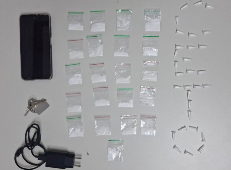 Na ação, foram encontrados 21 trouxas e 30 pinos de substância análoga à cocaína, além de um celular da marca Motorola, um carregador e um chaveiro com duas chaves.