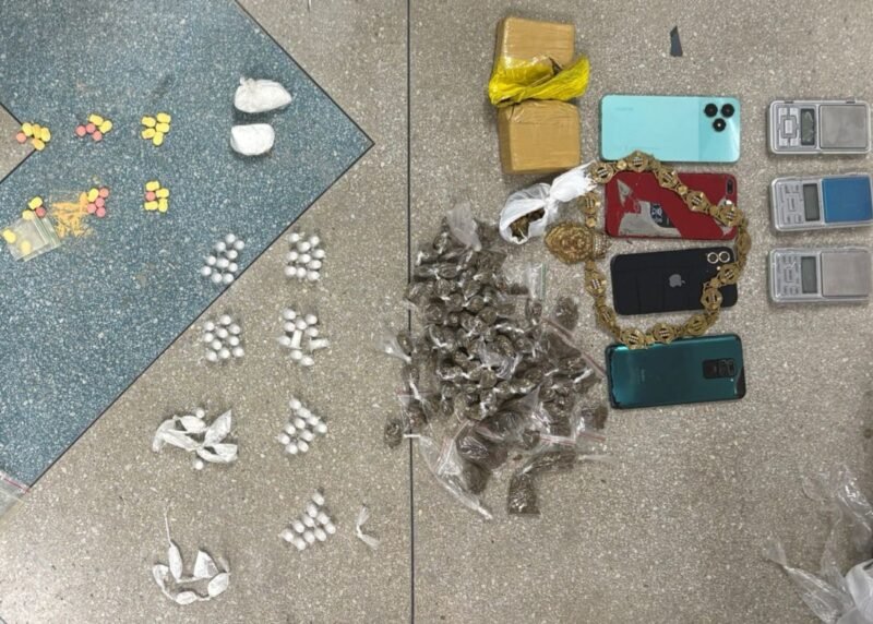 Ao todo, foram apreendidos 94 porções de maconha, dois tabletes da mesma droga, uma porção maior do entorpecente, 75 pinos de cocaína, duas porções maiores da substância e 40 comprimidos de ecstasy (MDMA). Também foram encontrados quatro aparelhos celulares, três balanças de precisão, uma corrente dourada e R$ 24 em dinheiro.
